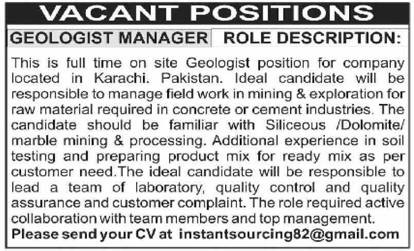instantsourcing82@gmail.com - سبجیکٹ لائن: “جیالوجسٹ مینیجر پوزیشن کے لیے درخواست”