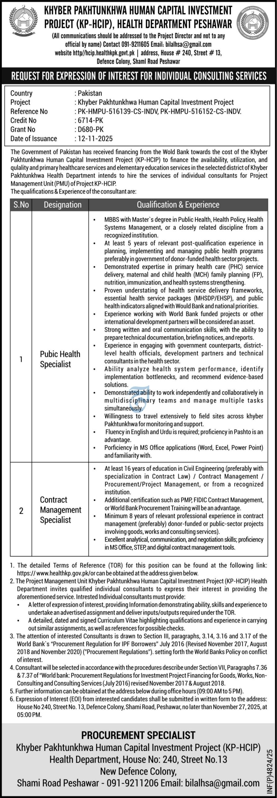 SEO Keywords: Public Health Consultant Pakistan, KP-HCIP Jobs 2025, World Bank Project Vacancies Peshawar, Contract Management Specialist KPK, Health Sector Consultancy Pakistan, Health Department Jobs 2025.