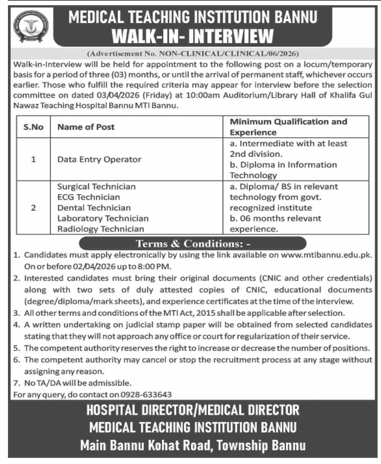 Medical Teaching Institute, Bannu March 31, 2026 by Ads Walk in Interview for different jobs at Medical Teaching Institute, Bannu