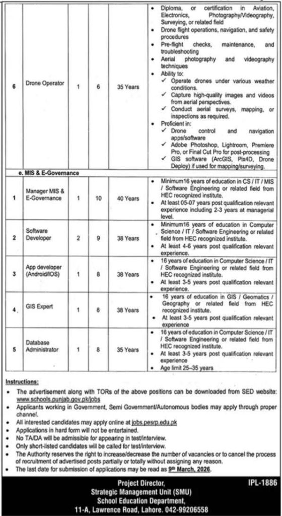 A total of 16 vacancies are available across six different roles including Drone Operator, Manager MIS & E-Governance, Software Developer, App Developer, GIS Expert, and Database Administrator. These positions offer an excellent opportunity to contribute to the digital transformation of Punjab’s education sector.