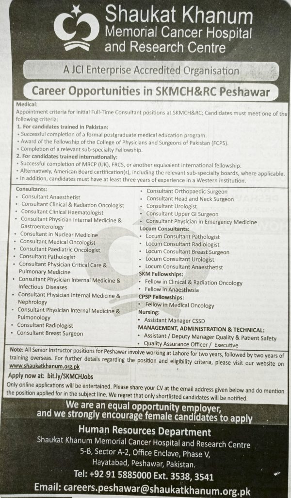 • Email: careers.peshawar@shaukatkhanum.org.pk