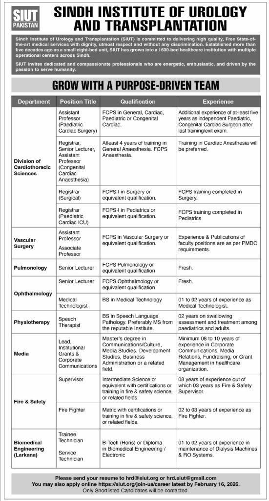 Joining SIUT means being part of a legacy that prioritizes human dignity and innovation. Employees benefit from professional development, a collaborative culture, and the satisfaction of serving the underprivileged. To apply, send your resume to hrd@siut.org or hrd.siut@gmail.com, or apply online at https://siut.org/join-us/career. The deadline is February 16, 2026. Only shortlisted candidates will be contacted. Don’t miss this chance to grow with a purpose-driven team! 3 12 14